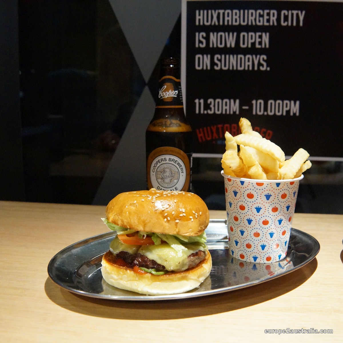 It was fully dark before we got out of there and we were both hungry. So we headed for a burger place around the corner, which Google recommended: Huxtaburger. Quite tasty stuff, and during happy hour (4 – 6pm) you get a Beer for 2 Bucks.