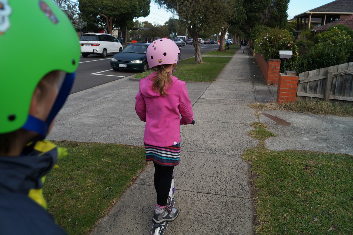 But in the end she got there and we made it on time to school. Rolling down-hill on their scooters, with their brand new helmets on, our two almost look like locals (except for the school uniforms).