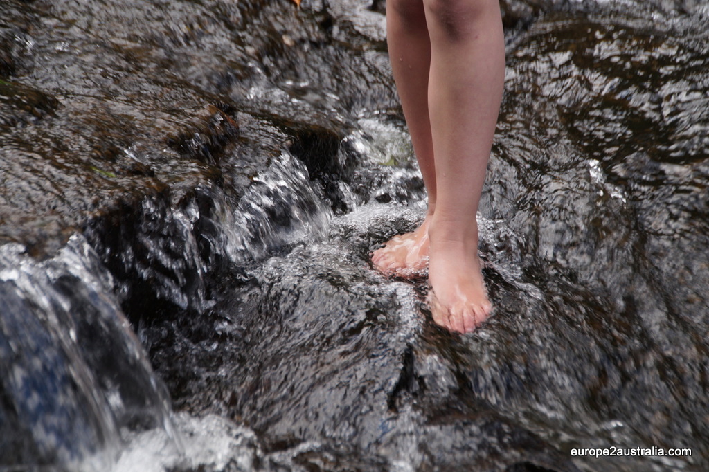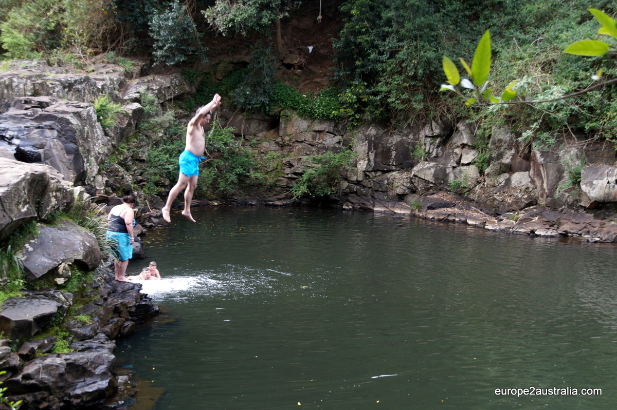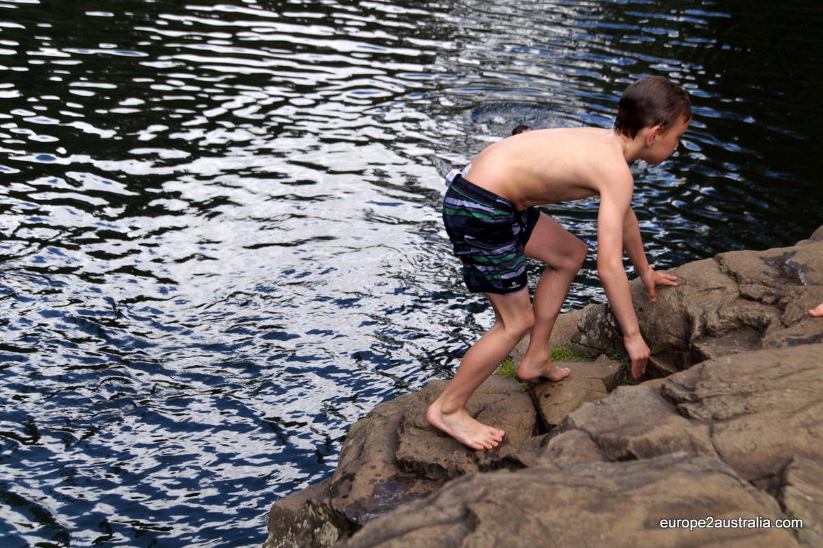 Although hiking might be a bit over rated with 400 meters walkway from the car park along the Obi Obi Creek to the Falls. The falls easily make up for it though. The rock pool is a little piece of paradise. You can walk the shallow parts or take a three meter jump in the cold rock pool, which Oliver and Kai did. Unfortunately, just as I was about to think about considering to take the jump as well, a tropical rain started poring down.