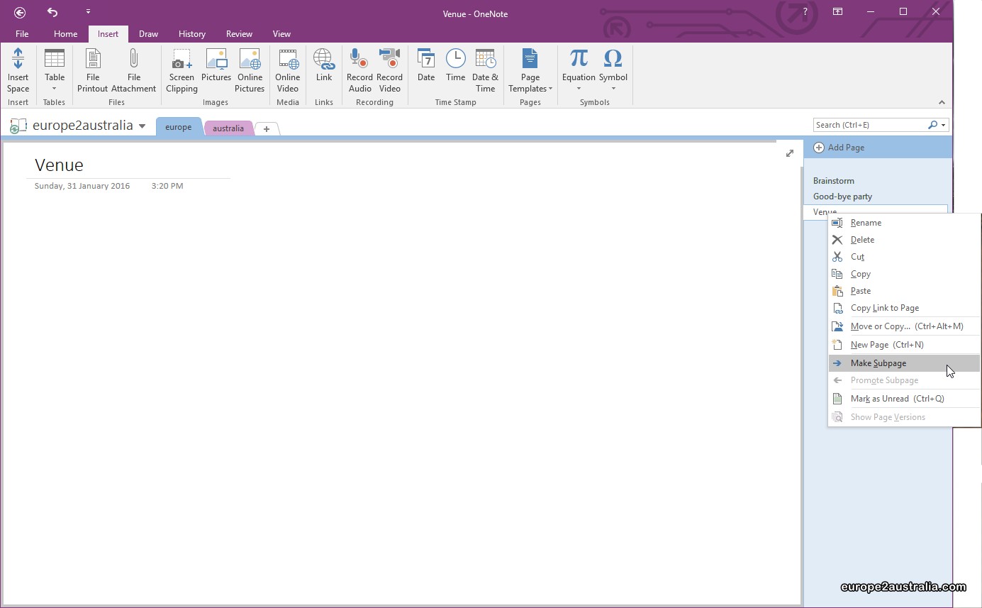 As mentioned above, the tabs offer a level of grouping. The next level down is using the Subpage feature. So for each topic identified in the brainstorm session, I created a page and for each bullet point a subpage. Again, making things a bit more organised.