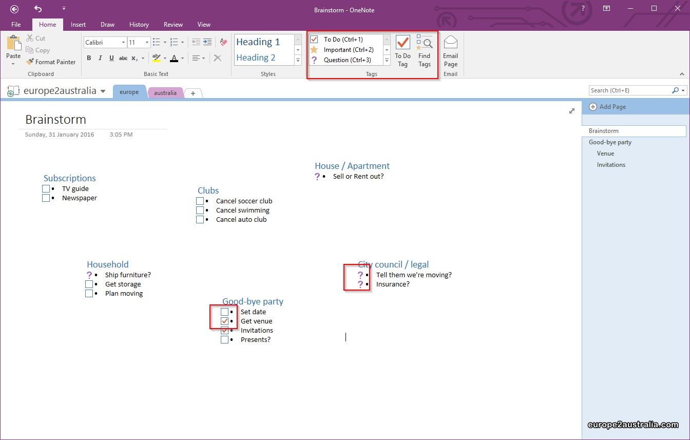 You might notice the boxes and question marks in front of the bullet points. These are called Tags in OneNote. They help structuring you thoughts, as well as making them easy to find. I used the ToDo Tag for ToDo items and the Question Tag for decisions to be made. (Note that you can check a ToDo item, once it is done.)
