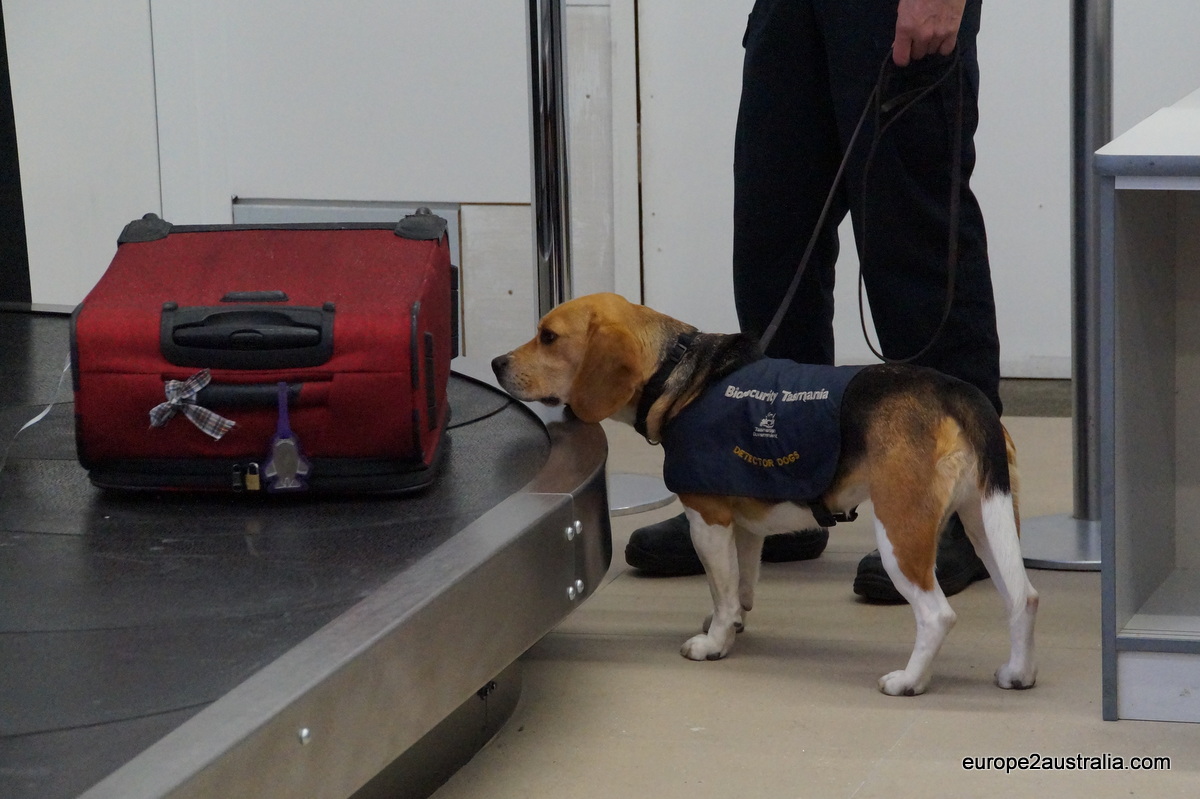 Getting the bags from the one carrousel they have at the airport took a while, but it gave us the chance to watch the sniffer dog in action. It was looking for fresh fruit and seeds, which you are not allowed to bring into Tassie.